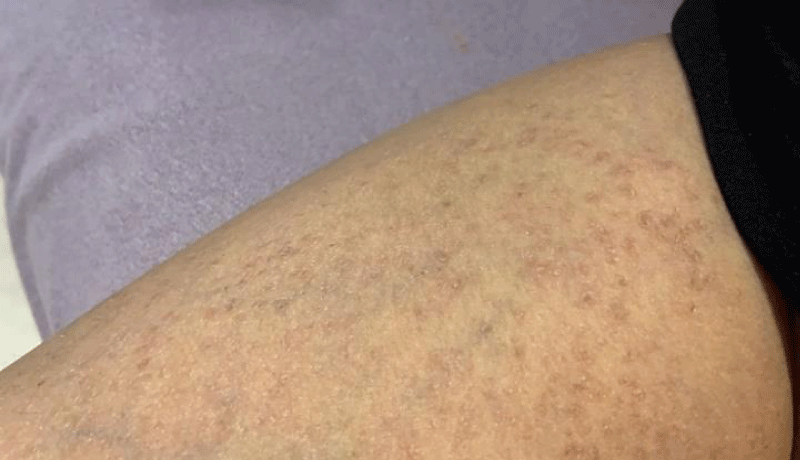 Figure 1: Multiple symmetrically distributed tiny erythematous scaly xerotic papules on the thigh.